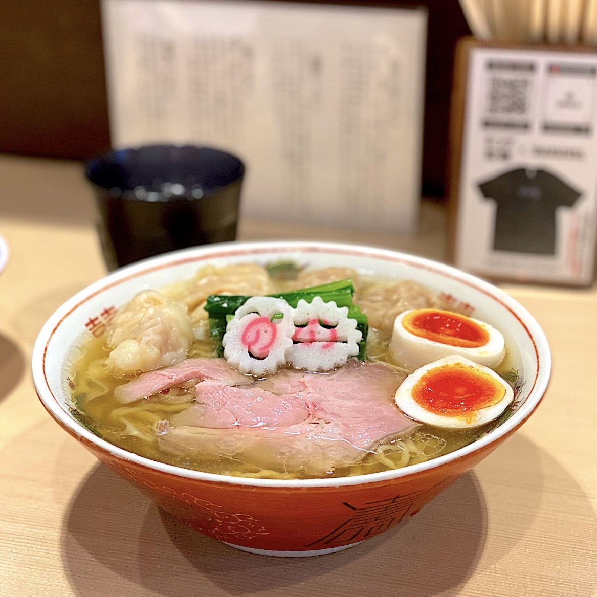 来ました!ワンタン麺白だし!わたしは3歳の息子と分けっこ。子どものラーメンの鳴門は顔つきでした。こういうサービス、うれしいですね。